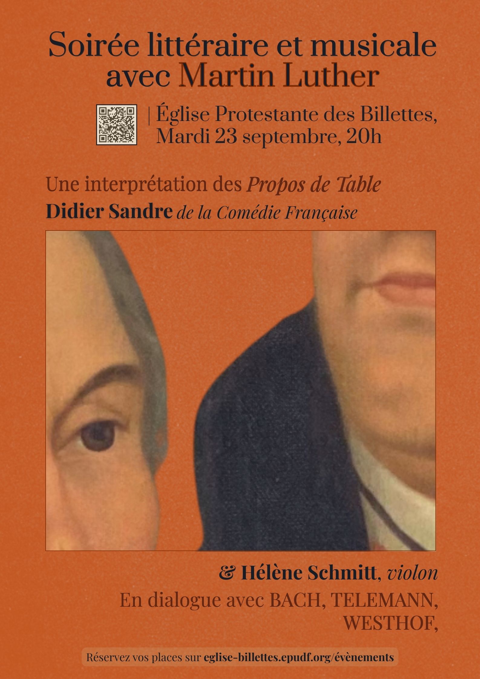 Un proposition rare avec des artistes d’exception : Didier Sandre (sociétaire de la Comédie-Française) donnera voix aux Propos de Table et aux lettres intimes de Luther – des textes profonds, caustiques et lumineux. La violoniste baroque Hélène Schmitt dialoguera en musique à travers des œuvres de Bach, Telemann, Westhoff et autres contemporains.